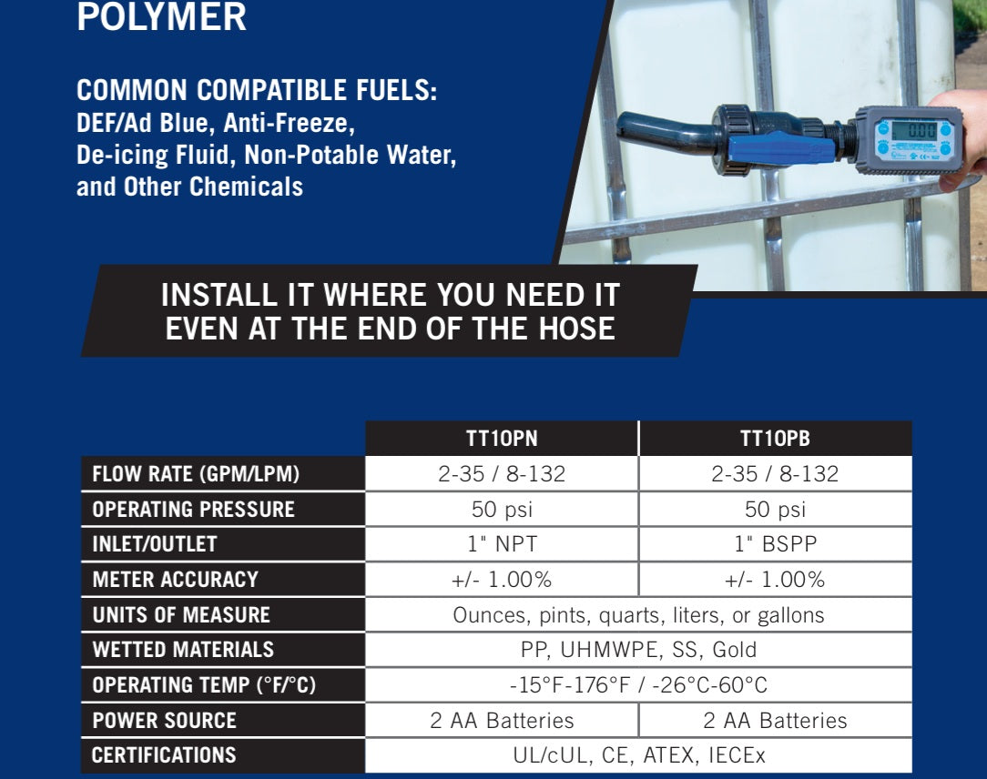 Sotera Digital In Line 4 Digit Turbine Chemical Transfer Meter 1 Inch FPT 2-35 GPM - TT10PN