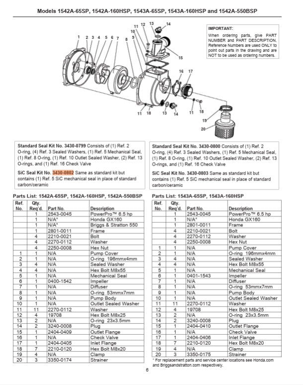 Pump repair kit Models 1542A-65SP, 1542A-160HSP, 1543A-65SP, 1543A-160HSP and 1542A-550BSP
