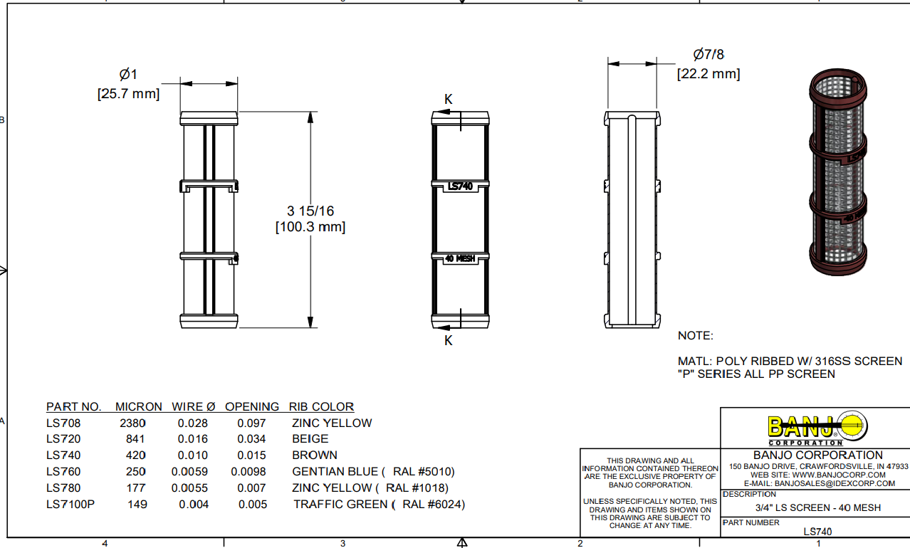Banjo 40 Mesh Line Strainer Screen for 1/2" and 3/4" Y Strainers - LS740 is backordered and will ship as soon as it is back in stock.