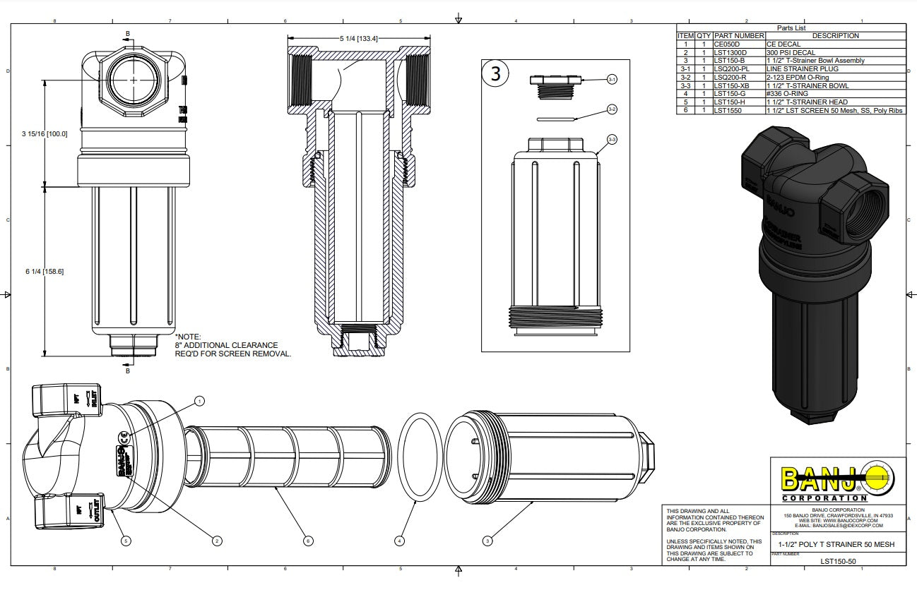 Banjo T Strainer With 50 Mesh Stainless Steel Screen 1-1/2" X 1-1/2" - LST150-50 is backordered and will ship as soon as it is back in stock.