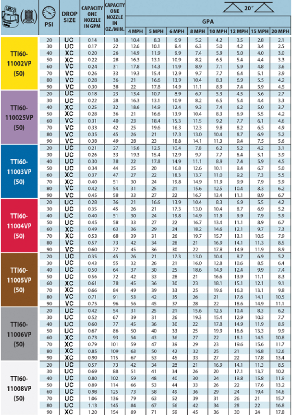 * TTI60 produces two 110° wide angle, flat spray patterns for uniform coverage in broadcast applications.